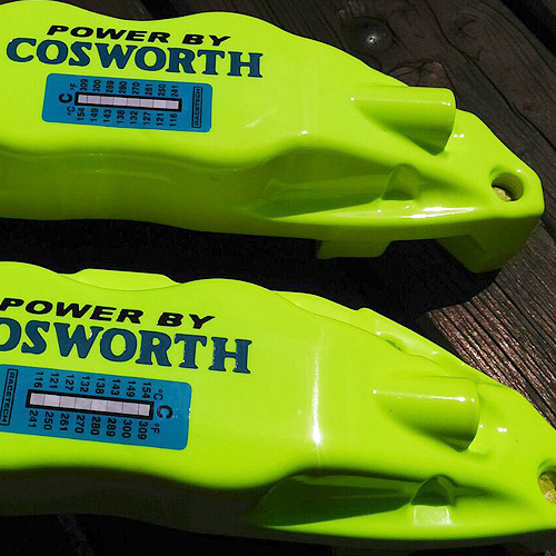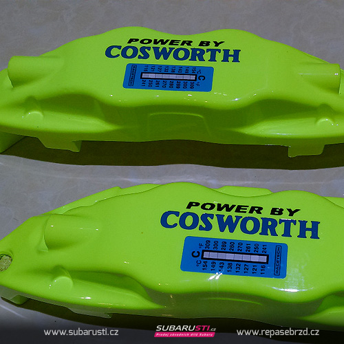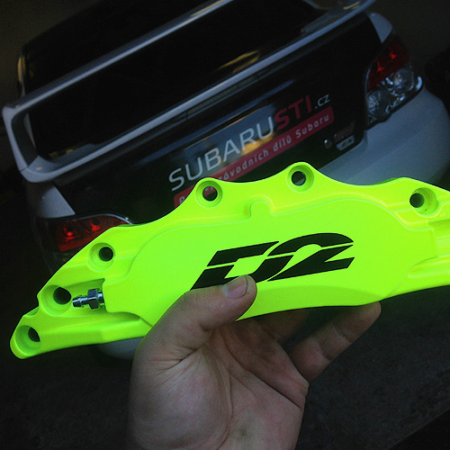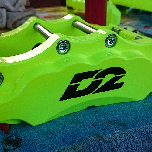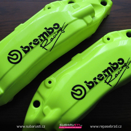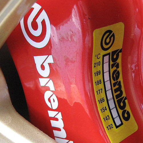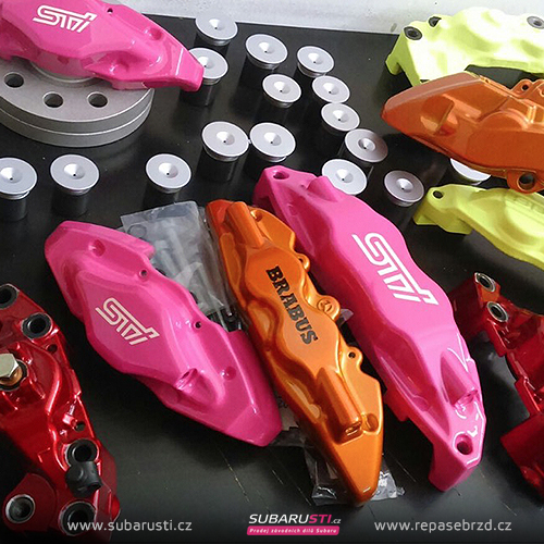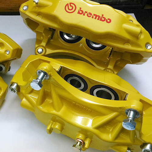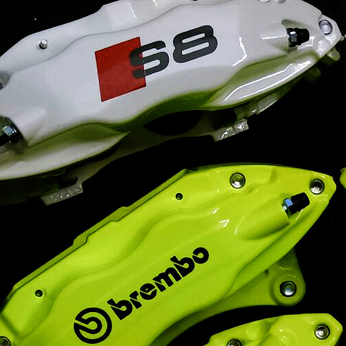 Námi nanášené barvy jsou odolné vůči soli, chemikáliím, brzdové kapalině a běžným čistícím prostředkům na vozy. Teplotní odolnost barvy je okolo 230 stupňů na povrchu brzdiče, stálost odstínu je 5 let. Používáme polyesterový lak, tedy stejný jako firmy AP a Brembo. Tento lak je vhodný pro venkovní použití a odolný proti UV záření. Na brzdiče jsme také schopni nalakovat loga dle tvého přání. Loga jsou nanášena vrstvou barvy, nikoliv samolepkou, a poté překryta finálním ochranným lakem.